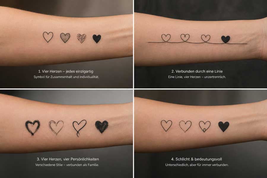 Die Auswahl des Motivs für ein Familientattoo ist häufig eine Herzensangelegenheit, die die gemeinsamen Werte und die Verbundenheit der Familienmitglieder illustriert. Von Tiermotiven, die die Charaktereigenschaften der Familie symbolisieren, bis hin zu spezifischen Daten oder Namen, die bedeutende Momente hervorheben – jedes Tattoo für die ganze Familie ist einzigartig. Besonders beliebt sind unendliche Zeichen oder keltische Knoten, die die ewige Bindung und den Zusammenhalt der Familie widerspiegeln.